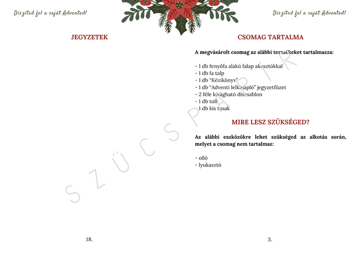 Ebben az adventi naptárban az a jó, hogy részed lehet mind gyakorlati, mind lelki növekedésben is. A fenyőfa alakú falapra neked kell felakasztani a díszeket a 24 nap során. Azonban a díszeket még számok nélkül kapod, amelyeket ki kell vágni.